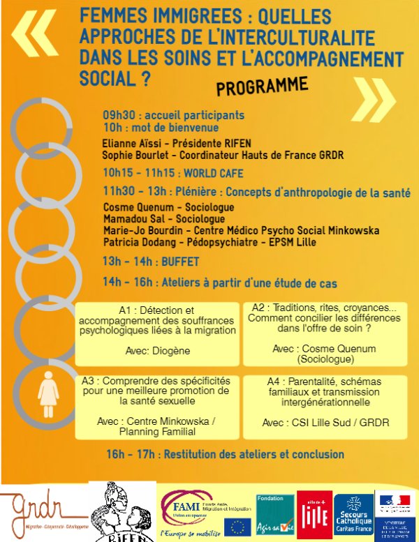 Dans le cadre des Journées Thématiques Santé de la mairie de Lille, le Grdr et la RIFEN organise un forum d’échange réunissant les professionnels de la santé et du social autour de l’approche interculturelle de la santé et de l’accompagnement social des femmes immigrées.