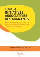 – Le Forum : ’Initiatives associatives des migrants : entre engagement citoyen en France et développement de territoires dÂ’origine’, à lÂ’initiative du GRDR et impliquant plusieurs de ses programmes (Appui aux mouvements associatifs des migrants, Bien Vieillir en France, OMD pour OMD, Scolarisation et accompagnement des femmes migrantes).