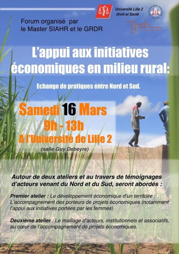 Parce que le développement économique en milieu rural est un thème aux enjeux forts, tant sur les territoires du Nord que du Sud, il semble essentiel de réfléchir collectivement aux questions que cela pose. Dans cette optique, le master 2 SIAHR (Solidarité Internationale, Action Humanitaire et Reconstruction), sur proposition du GRDR, vous propose ce temps dÂ’échange de pratiques, mettant en parallèle des expériences de développement économique sur les territoires du Nord et du Sud.