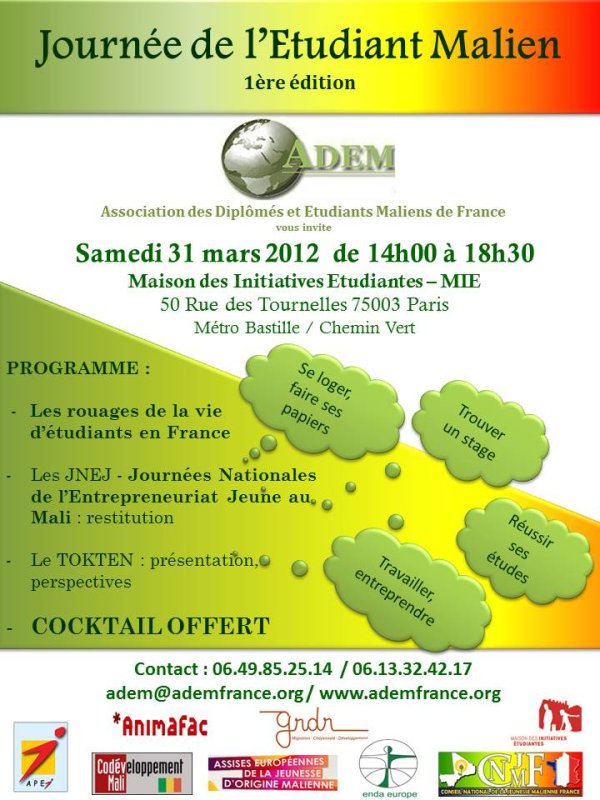 Tel est le thème de cette première édition de la journée des étudiants maliens qui se tiendra le 31 mars 2012 à Paris.